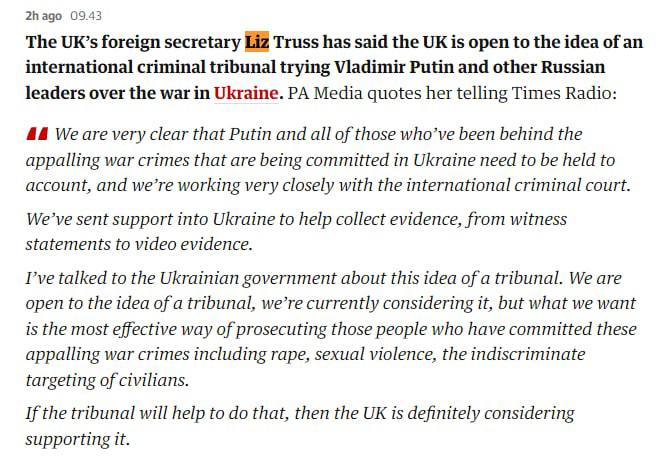 "Я говорила с украинским правительством об этой идее трибунала. Мы открыты к ней, мы сейчас ее рассматриваем, но мы хотим наиболее эффективного способа преследования тех людей, которые совершили эти ужасные военные преступления, включая изнасилование, сексуальное насилие, неизбирательные нападения на гражданских лиц" - заявила Трасс.