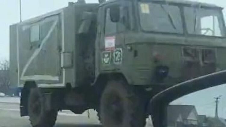 На грузовиках и танках РФ нанесена символика с буквами Z и V. Скриншот видео