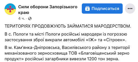 Россия продолжает вывозить зерно с захваченных территорий. Сегодня РФ вывезла уже 1200 тонн зерна с территории механизированного зернохранилища в Запорожской области.