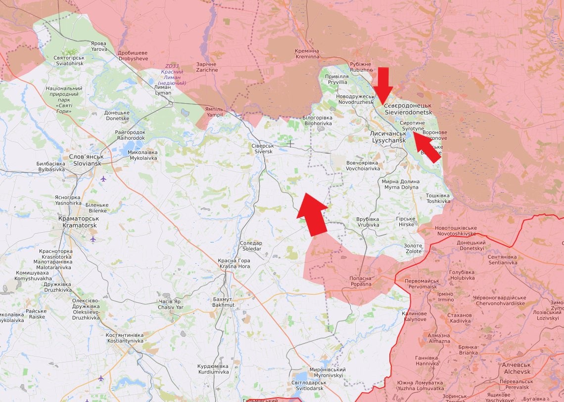 - на север, с целью зайти в тыл и окружить группировку украинских войск в Северодонецке и Лисичанске;