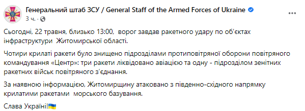 "Сегодня, 22 мая, около 13:00 враг нанес ракетный удар по объектам инфраструктуры Житомирской области. Четыре крылатые ракеты были уничтожены подразделениями противовоздушной обороны воздушного командования "Центр": три ракеты ликвидированы авиацией и одна - подразделением зенитных ракетных войск воздушного соединения", - говорится в сообщении.