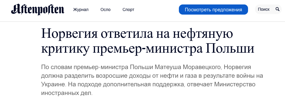 К слову, его доходы упали на 50 миллиардов долларов за последний год, поэтому, говорят в Норвегии, сверхприбылей, о которых говорил Моравецкий, там нет.