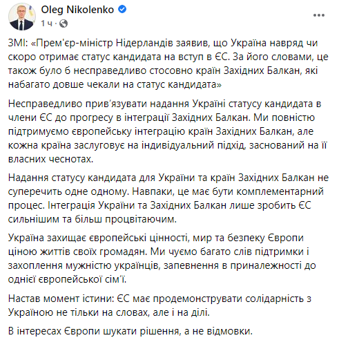 Так ответил спикер МИД Олег Николенко у себя в Facebook на заявление премьера Нидерландов, который не считает, что Украина в ближайшее время не может стать кандидатом на вступление в ЕС.