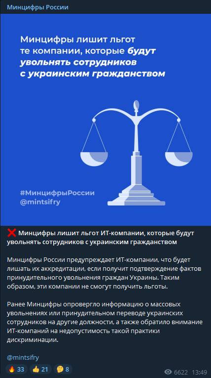 "Минцифры России предупреждает IT-компании, что будет лишать их аккредитации, если получит подтверждение фактов принудительного увольнения граждан Украины. Таким образом, эти компании не смогут получить льготы", - говорится в сообщении.