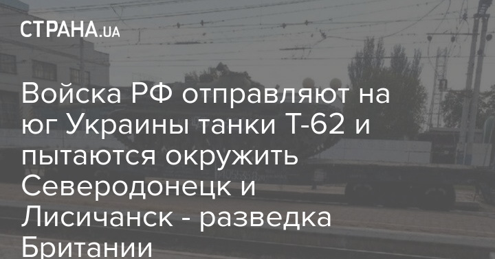 Британская разведка сообщает, что российские войска продолжают попытки окружить Северодонецк и Лисичанск, а также перебрасывают танки Т-62 на юг Украины.