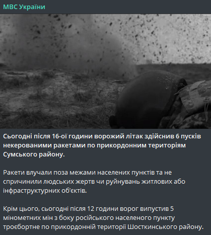19:20 В МВД рассказали подробности ракетного удара по Сумской области. По сообщению МВД, был совершен пуск 6 неуправляемых ракет.