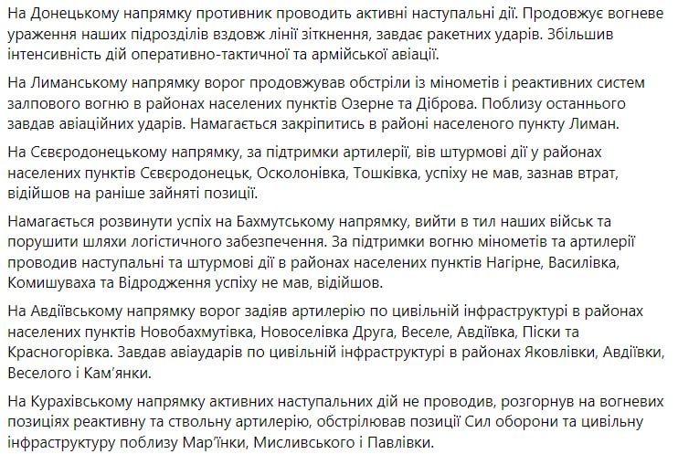 По данным Генштаба ВСУ, противник пытается вытеснить украинские подразделения из Лимана на севере Донецкой области и развить наступление на Славянск.