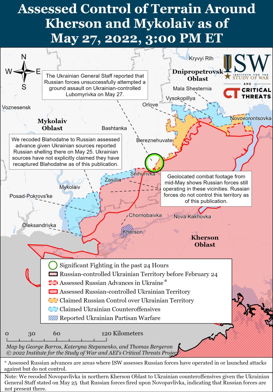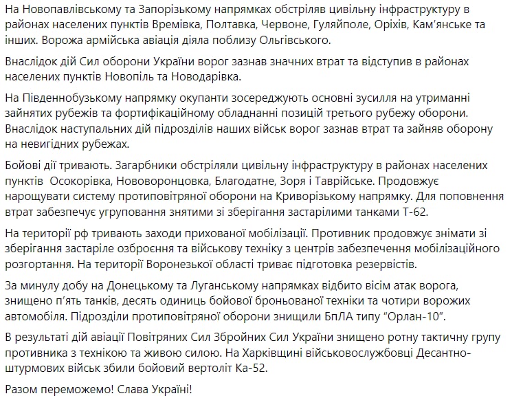 6. На южнобужском направлении (видимо, в районе Николаева) украинские войска перешли в контратаку. "В результате наступательных действий подразделений наших войск враг понес потери и занял оборону на невыгодных рубежах".