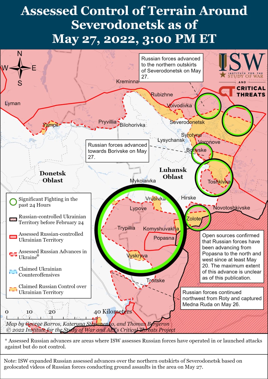 3. Российские войска в Попасной стремятся продвигаться на север, чтобы поддержать окружение Северодонецка, а не на запад, в сторону Бахмута.