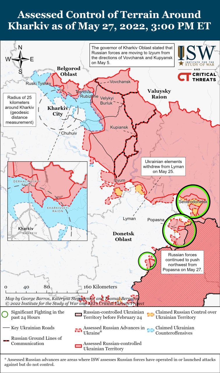 1. Российские войска начали прямые атаки на городскую застройку Северодонецка, который еще полностью не окружен. Тем не менее, атакующие силы будут вести городские бои.