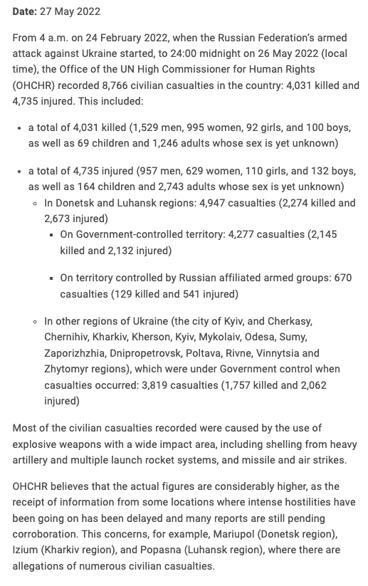 УВКПЧ считает, что фактические цифры значительно выше, поскольку получение информации из некоторых мест, в которых продолжаются интенсивные боевые действия, задерживается, а многие отчеты все еще ждут подтверждения.
