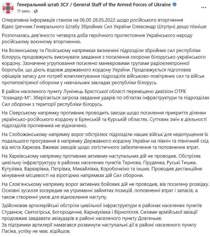 Контратака ВСУ на юге, "Искандер" в Беларуси и бои за Северодонецк. Генштаб опубликовал новую сводку с фронта