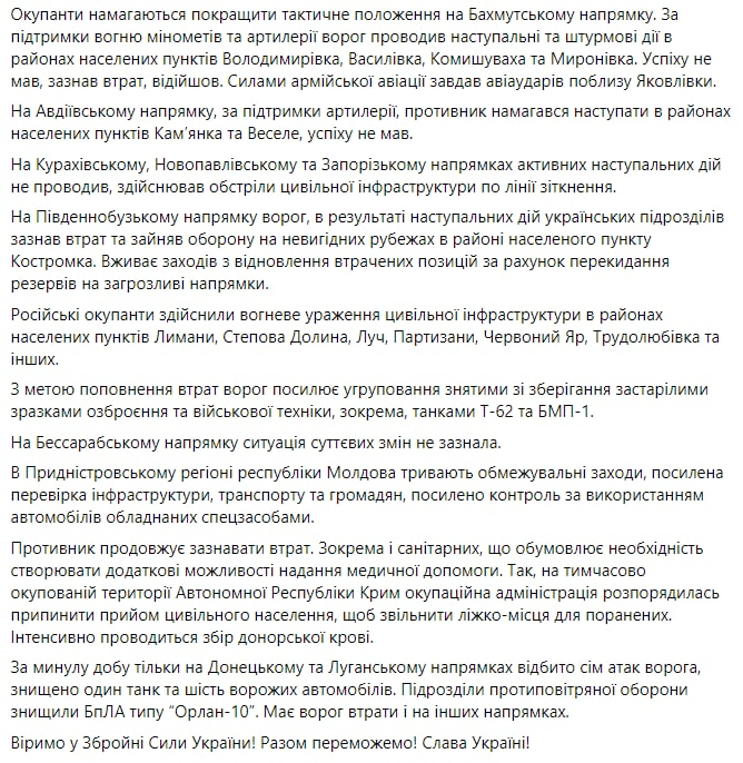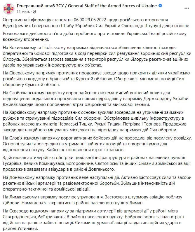 В ней сообщается, что штурм Северодонецка продолжается, противник пытается закрепиться в Лимане. Произвел несколько безуспешных атак от Попасной в направлении трассы Лисичанск-Бахмут.