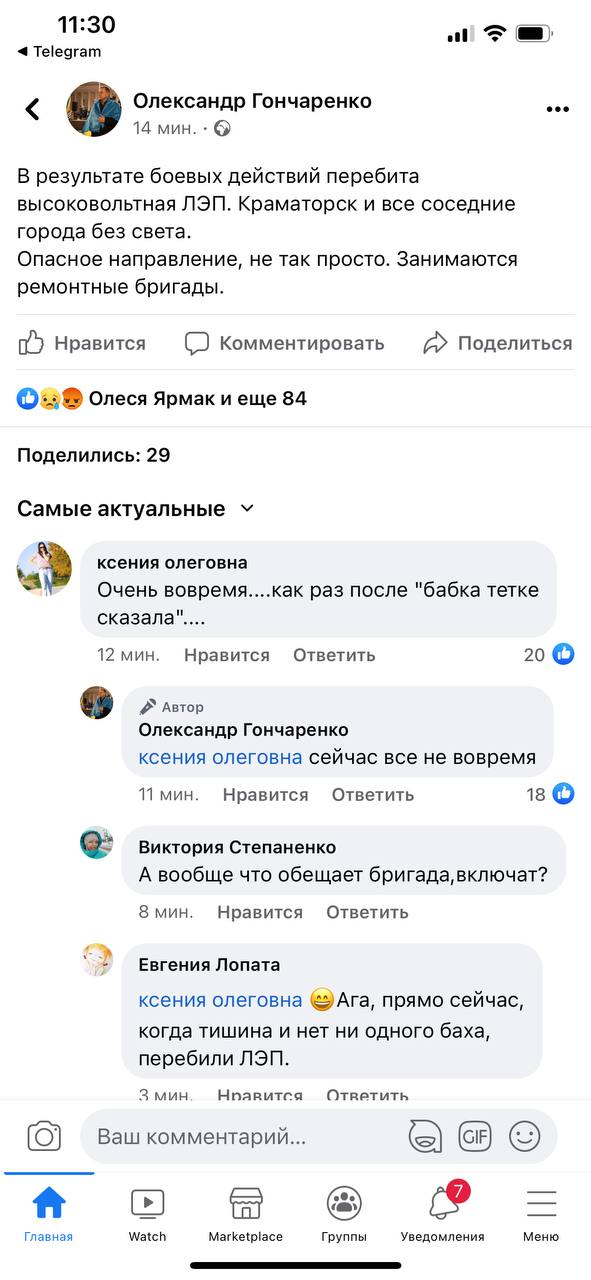 "Опасное направление, не так просто. Занимаются ремонтные бригады", - пишет Гончаренко.