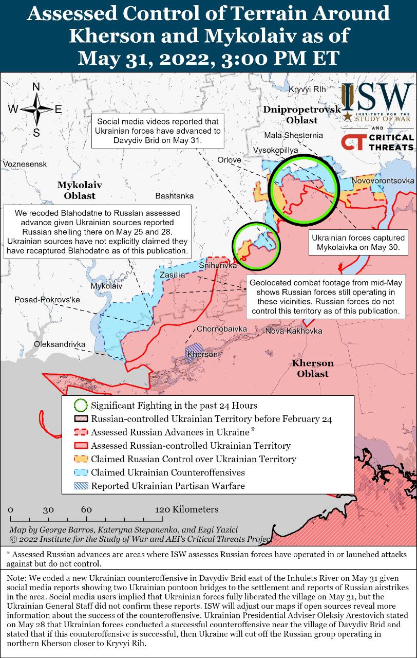 - Российские наземные операции остаются сосредоточенными в небольшом секторе Луганской области. С 30 по 31 мая активизировались бои на улицах Северодонецка, российские войска приближались к центру города. Скорее всего, более половины города в настоящее время оккупировано российскими войсками, в том числе чеченскими боевиками;