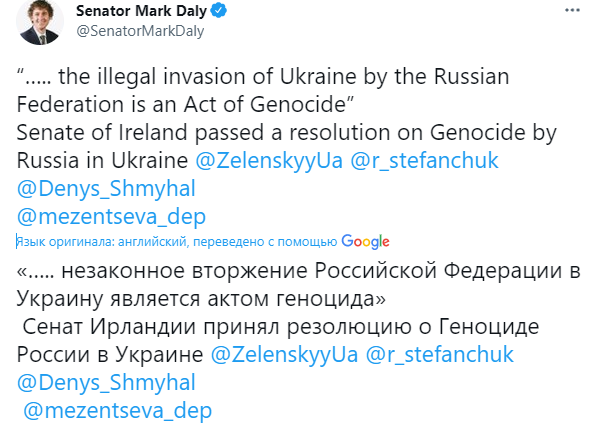 Сенат Ирландии принял резолюцию, осуждающую вторжение страны-агрессора России в Украину. Действия оккупантов признаны геноцидом.