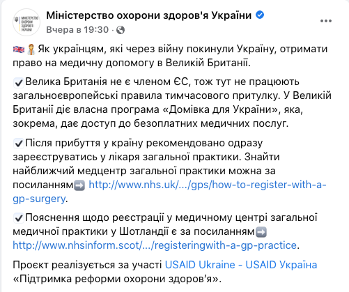 Минздрав рассказал украинским беженцам, как получить бесплатную медицинскую помощь в Великобритании