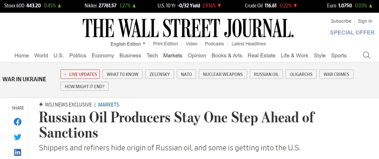 10:33 Российские производители нефти на шаг впереди санкций. Происхождение российской нефти скрывается, а ее часть попадает в США, пишет The Wall Street Journal.