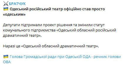 Вслед за переименованием русского академического театра драмы Леси Украинки в Киеве, в Одессе убрали название "русский" из театра в Одессе. Таким образом, Одесский русский театр официально стал просто "одесским". Об этом сообщил спикер ОВА Сергей Братчук в Телеграм.