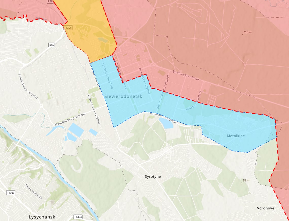 2. Касаемо Северодонецка - ВСУ сообщают, что враг продолжает штурм, но деталей о том, какую территорию он занял, не приводится. Губернатор Сергей Гайдай говорил о половине города под РФ. В тоже время главред сайта «Цензор» Юрий Бутусов пишет, что украинские войска контролируют только промзону и прилегающий к ней квартал.