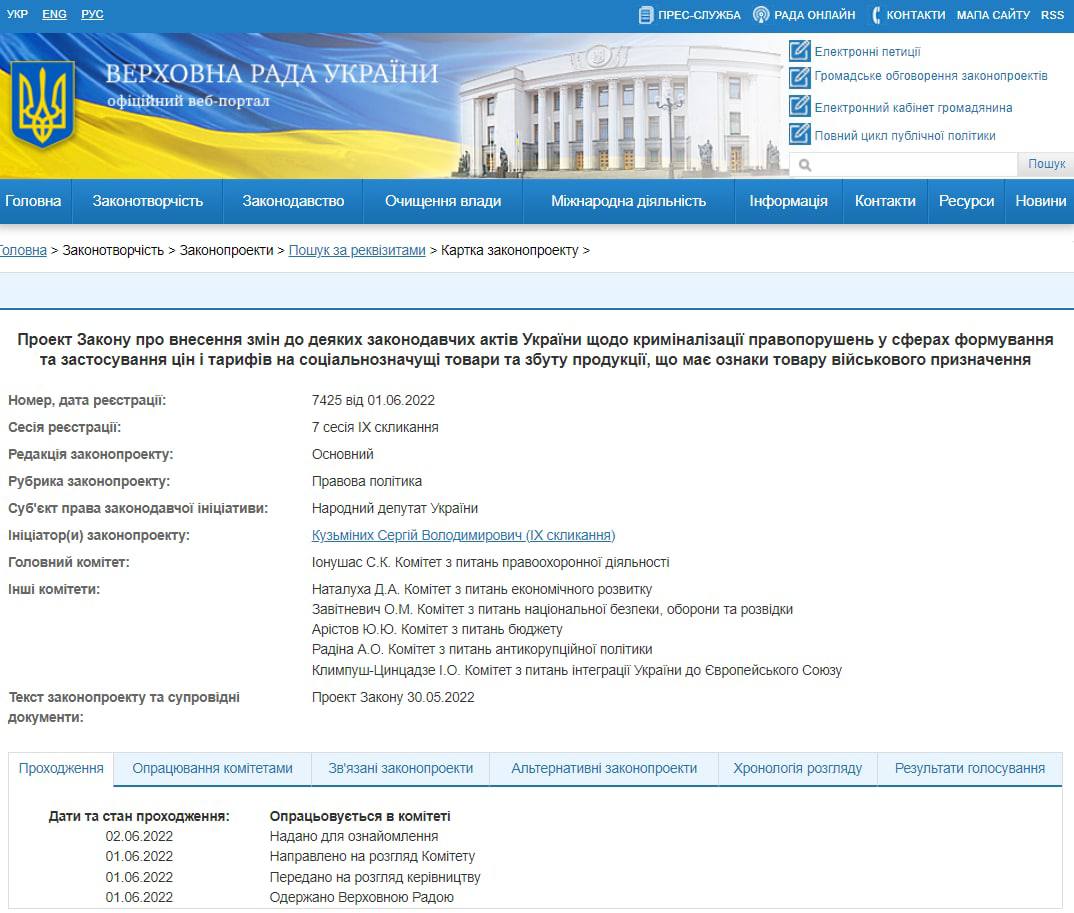 Законопроект №7425, зарегистрированный на сайте парламента, предлагает ввести уголовную ответственность за завышение цен на социально-значимые товары и товары военного назначения. За спекуляцию предлагается наказывать вплоть до 3-5 лет лишения свободы.