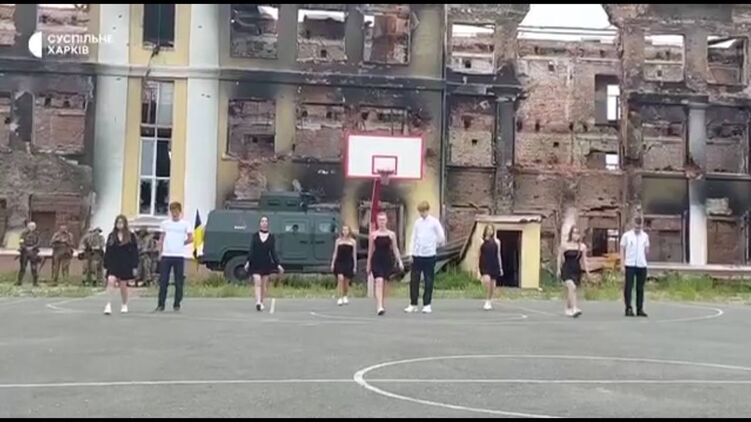 На фоне разрушенной из-за боевых действий 134-й школы Харькова выпускники станцевали Выпускной вальс.
