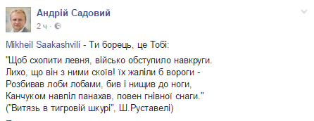 Одним из самых положительных комментариев в поддержку Саакашвили стали слова мэра Львова Андрея Садового, которые он опубликовал на своей странице в Facebook.