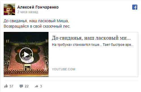 Как сообщала "Страна", в сети появилось видео под названием "До свидания, Миша!", в котором, под известную песню об олимпийском мишке, собрали кадры из жизни теперь уже экс-губернатора Михаила Саакашвили во время его работы на посту главы Одесской области.