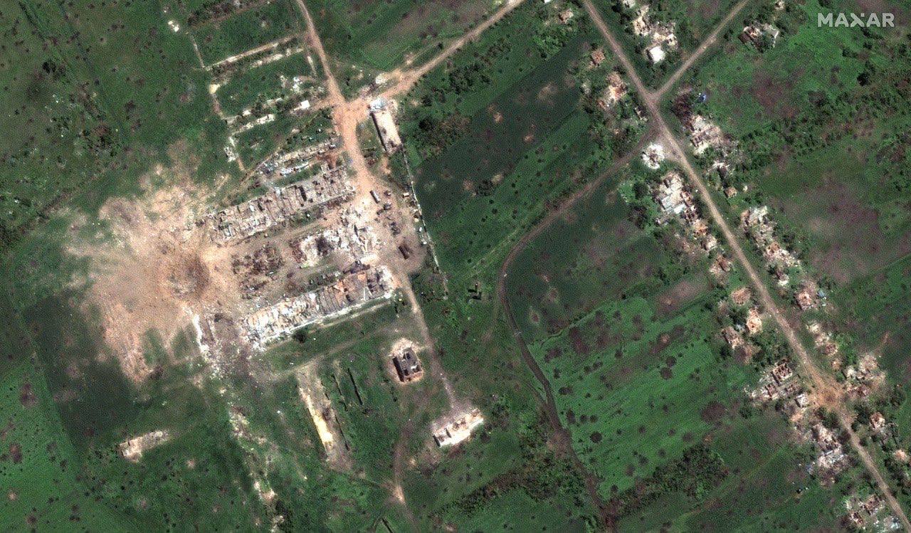 Maxar Technologies публикует фото поля в районе села Долгенькое, изрешеченного снарядами, а также огромную воронку от взрыва в самом селе.