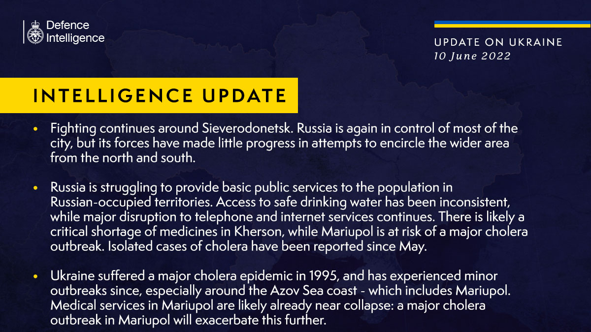 09:00 Британская разведка в своей сводке начала развивать темы холеры в Мариуполе. И в целом ситуации на оккупированных территориях.