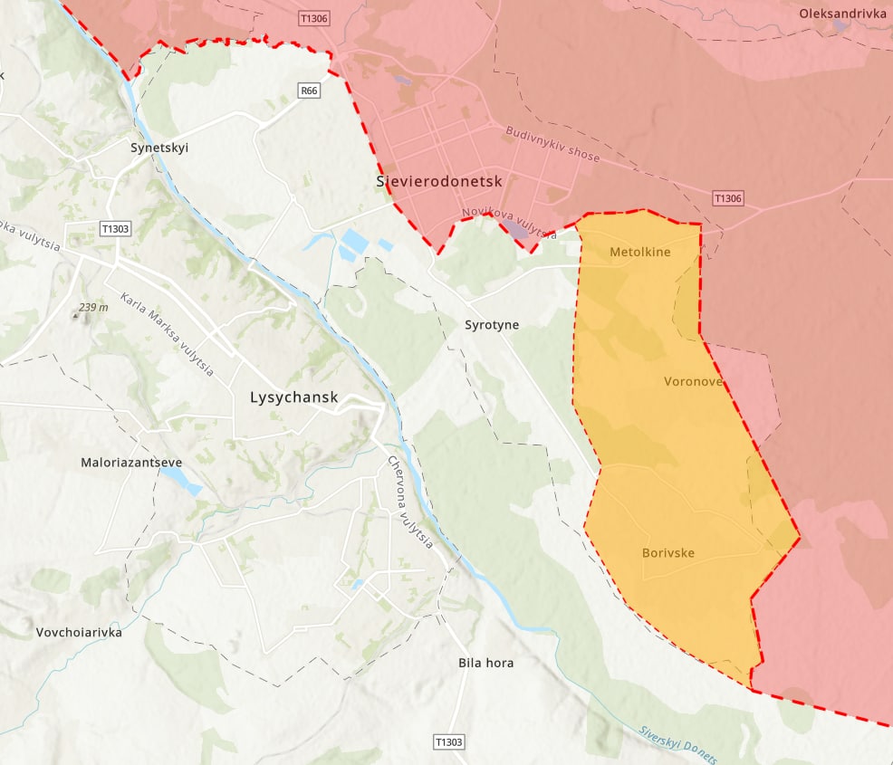 1. В Северодонецке отражен предполагаемый захват Метелкино и Боровского - поселков, находящихся в черте города на юге. В жилой застройке граница российского контроля идет примерно до улицы Пивоварова.