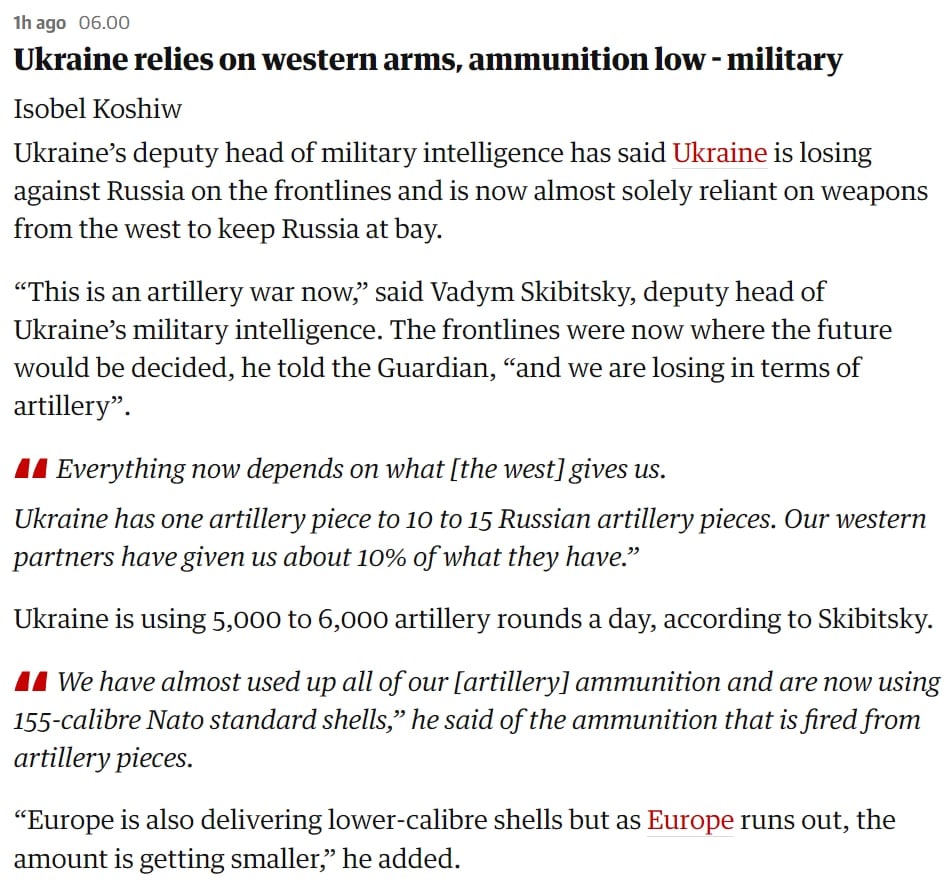 Боеприпасов у украинцев явно не хватает, опять же по их собственному признанию. Вадим Скибицкий, заместитель начальника военной разведки Украины, заявил, что Украина использует от 5000 до 6000 артиллерийских снарядов в день и «почти израсходовала» свой запас советских 152-мм стандартных снарядов. Теперь ВСУ используют 155-мм гаубицы стандарта НАТО; неясно, сколько их есть…
