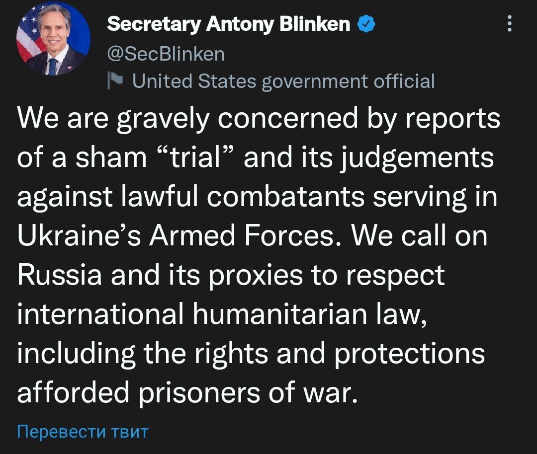 "Мы призываем Россию и ее марионеток уважать международное гуманитарное право, включая права и защиту, предоставляемые военнопленным", - написал он в Twitter.
