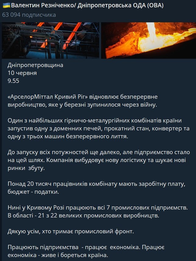 10:12 В Кривом Роге возобновляет работу крупнейший в Украине металлургический комбинат "Арселор Миттал", который ранее остановился из-за войны.