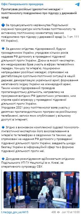 10:51 Генпрокуратура заочно объявила о подозрении известному украинскому политологу Михаилу Погребинскому. Его подозревают по статье 111 (госизмена).