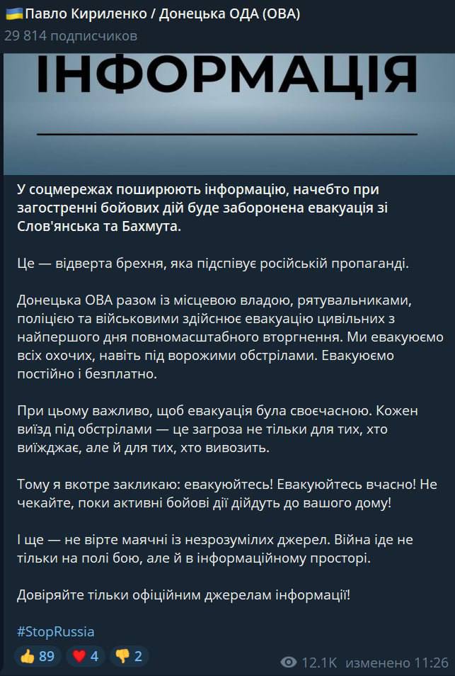 - "Тихая" эвакуация возможна только из Лисичанска и Горской общине, туда же есть возможность завозить гуманитарку.