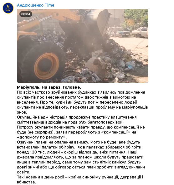 Также он пишет, что оккупанты массово сносят поврежденные дома, а людей просто выселяют. Во дворах многоэтажек появляются масштабные свалки.
