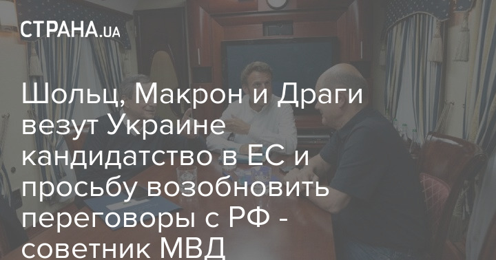 Канцлер Германии Олаф Шольц, президент Франции Эммануэль Макрон и председатель совета министров Италии Марио Драги, которые сегодня на поезде прибыли в Украину, везут нашей стране "кандидатство в ЕС".