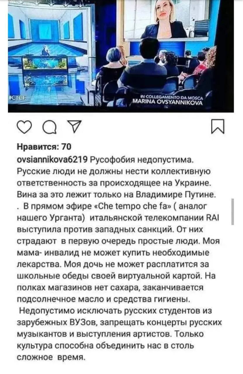 По ее словам, Овсянникова - "прокремлевский чревовещатель" а ее "поступок напрочь перечеркнут ее нынешней риторикой". Лидия имеет в виду пост Овсянниковой с критикой санкций против России.