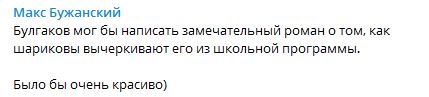"Булгаков мог бы написать замечательный роман о том, как шариковы вычеркивают его из школьной программы. Было бы очень красиво" - прокомментировал решение образовательной комиссии депутат "Слуги народа" Максим Бужанский.
