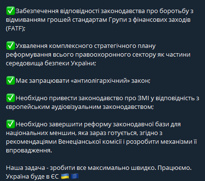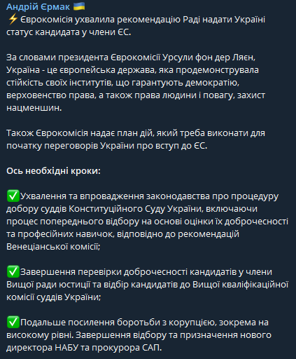 В свою очередь, глава ОП Андрей Ермак рассказал, какие шаги необходимо выполнить Украине для получения статута кандидата на членство в ЕС.