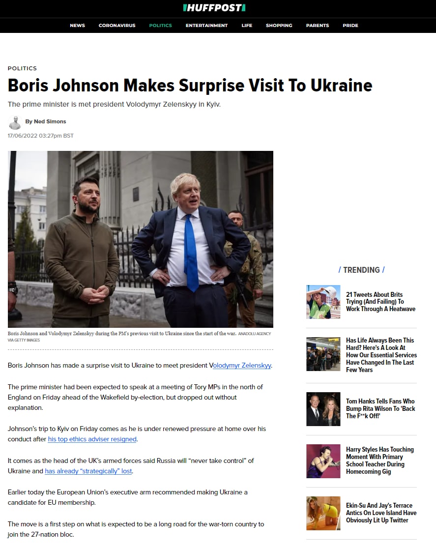 "Поездка Джонсона в Киев в пятницу связана с возобновлением давления на него", пишет Huffington Post