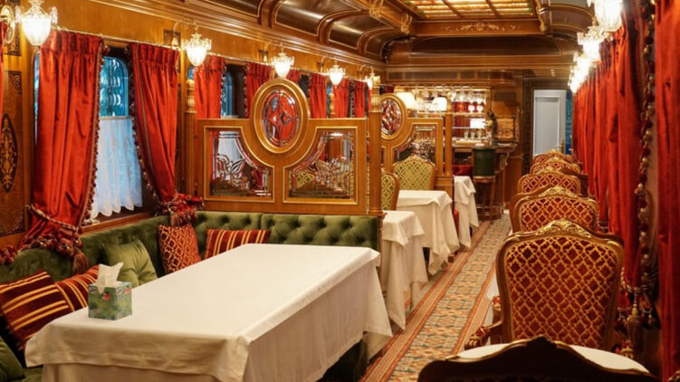 - железнодорожный вагон-ресторан с мебелью и предметами интерьера;