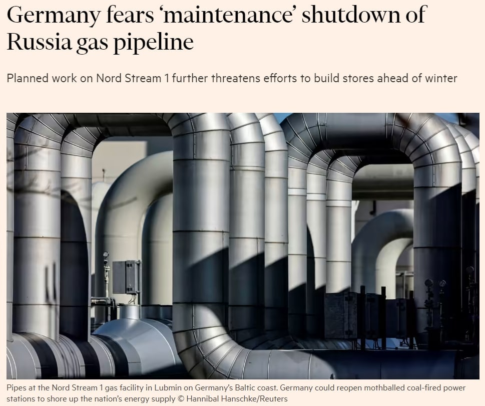 10:00 Правительство Германии опасается, что Россия использует техобслуживанием газопровода Nord Stream - 1, чтобы полностью перекрыть подачу газа, что повысит риск зимнего энергетического кризиса, пишет Financial Times.