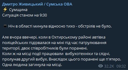 10:42 В Сумской области машина полицейских подорвалась на мине, есть раненые и погибший, сообщил глава Сумской областной военной администрации Дмитрий Живицкий в Telegram.