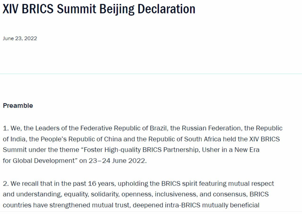 "Мы также обсудили наши опасения по поводу гуманитарной ситуации в Украине и вокруг нее и выразили поддержку усилиям Генерального секретаря ООН, агентств ООН и МККК по оказанию гуманитарной помощи в соответствии с базовыми принципами гуманности, нейтралитета и беспристрастности, установленными в резолюции Генеральной Ассамблеи ООН 46/182", — заявляет БРИКС.