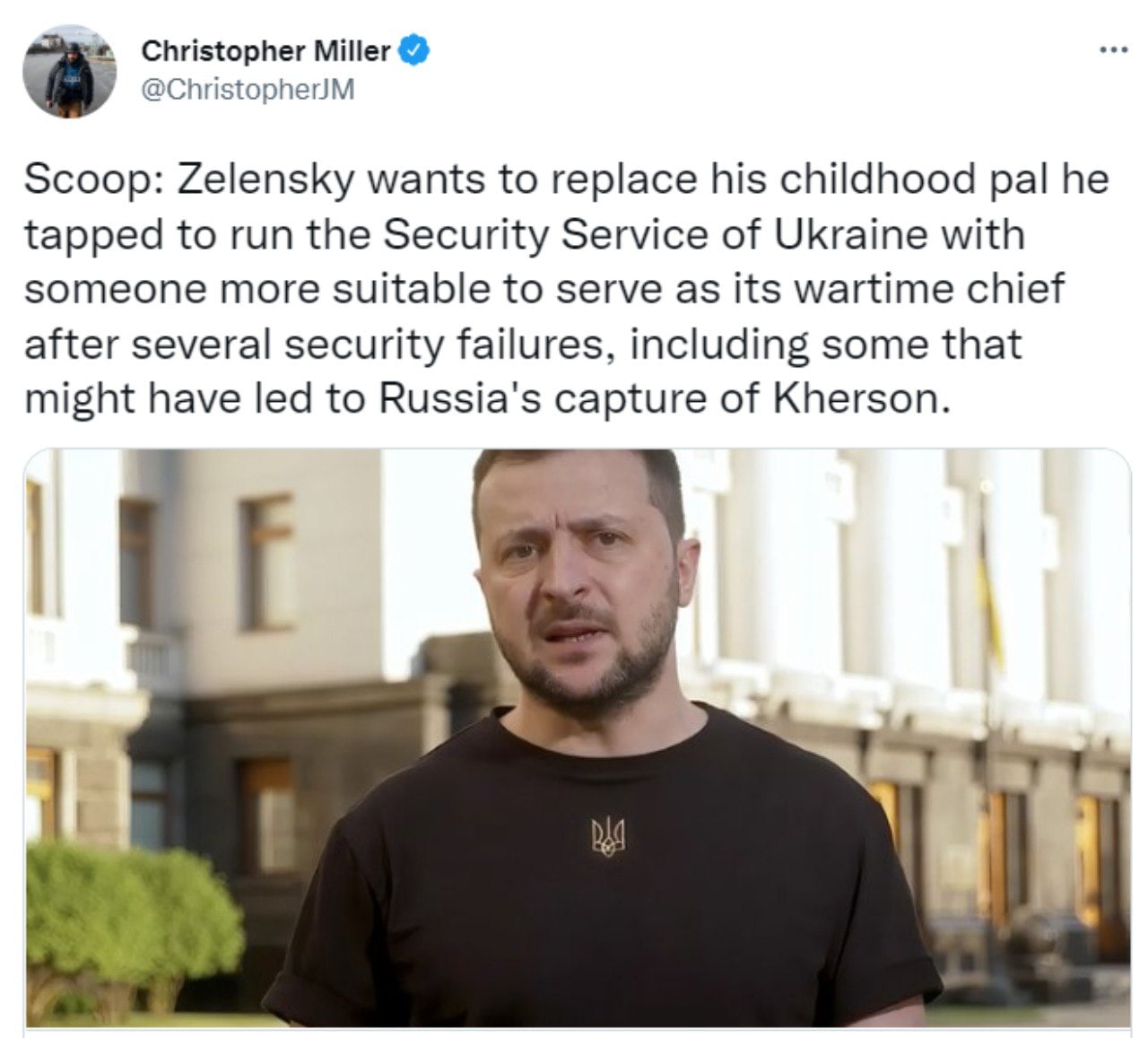 "Зеленский хочет заменить своего приятеля детства, которого он привлек для руководства Службой безопасности Украины, на кого-то, кто более подходит на пост ее главы в военное время, после нескольких неудач в сфере безопасности, в том числе тех, которые могли привести к захвату Россией Херсона", – пишет Миллер.