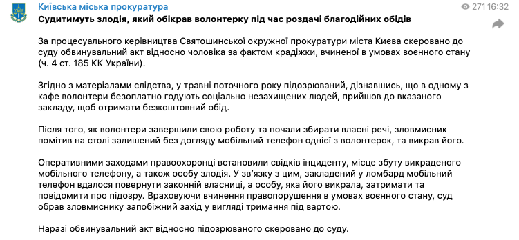 Киевская прокуратура уже передала дело против вора в суд, он арестован
