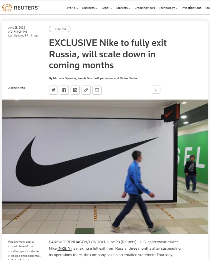 В Nike сообщили, что будут сворачивать свою деятельность в стране в течение нескольких месяцев и окажут поддержку своим сотрудникам.