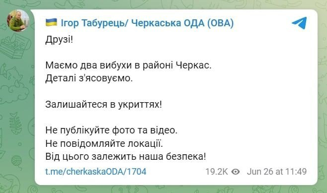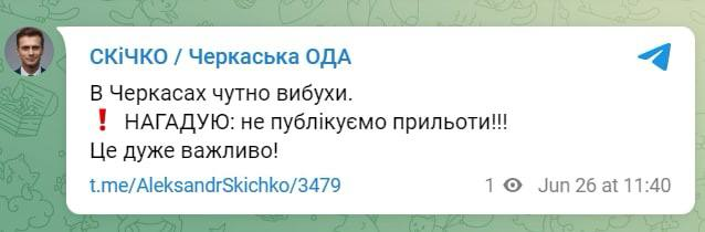 Позже глава Черкасской областной военной администрации Александр Скичко подтвердил взрывы в Черкассах.